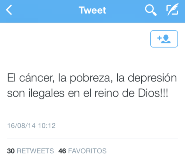 El tuit de un señor citaba a otro señor que dijo “El cáncer, la pobreza, la depresión, son ilegales en el reino de Dios!!!” …y después de un segundo de sentir una patada cibernética en el estómago, me incorporé y entendí: ¡no está hablando del Reino del Dios de la Biblia!… Ah… ¡que alivio! No podía ser… es de ooootro dios.
